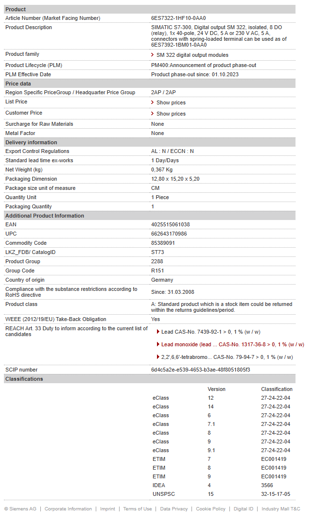 SIMATIC S7-300, Digital output SM 322, isolated, 8 DO (relay), 1x 40-pole, 24 V DC, 5 A or 230 V AC, 5 A, connectors with spring-loaded terminal can be used as of 6ES7392-1BM01-0AA0
