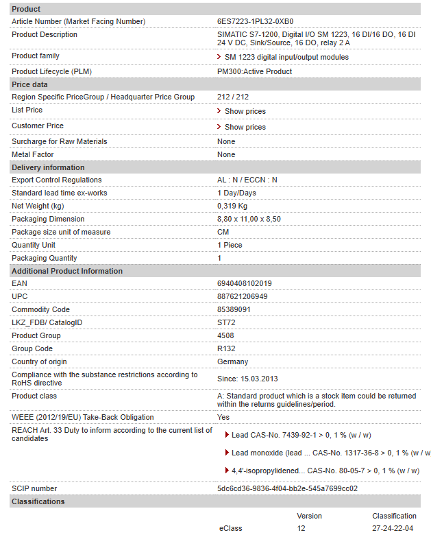SIMATIC S7-1200, Digital I/O SM 1223, 16 DI/16 DO, 16 DI 24 V DC, Sink/Source, 16 DO, relay 2 A