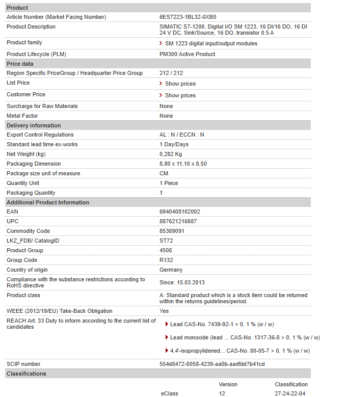 | SIMATIC S7-1200, Digital I/O SM 1223, 16 DI/16 DO, 16 DI 24 V DC, Sink/Source, 16 DO, transistor 0.5 A |