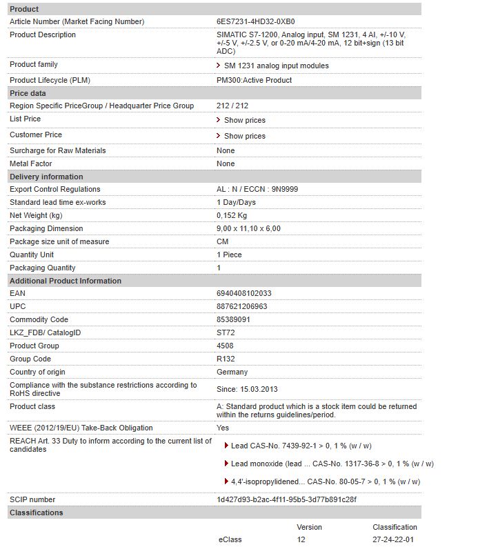 | SIMATIC S7-1200, Analog input, SM 1231, 4 AI, +/-10 V, +/-5 V, +/-2.5 V, or 0-20 mA/4-20 mA, 12 bit+sign (13 bit ADC) |