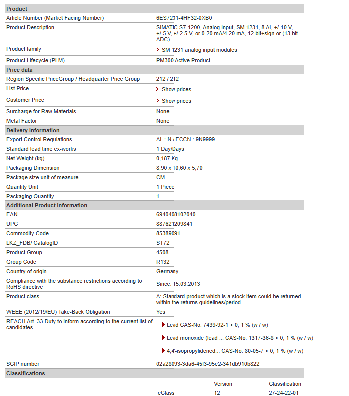 | SIMATIC S7-1200, Analog input, SM 1231, 8 AI, +/-10 V, +/-5 V, +/-2.5 V, or 0-20 mA/4-20 mA, 12 bit+sign or (13 bit ADC) |