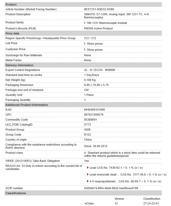 SIMATIC S7-1200, Analog input, SM 1231 TC, 4 AI thermocouples