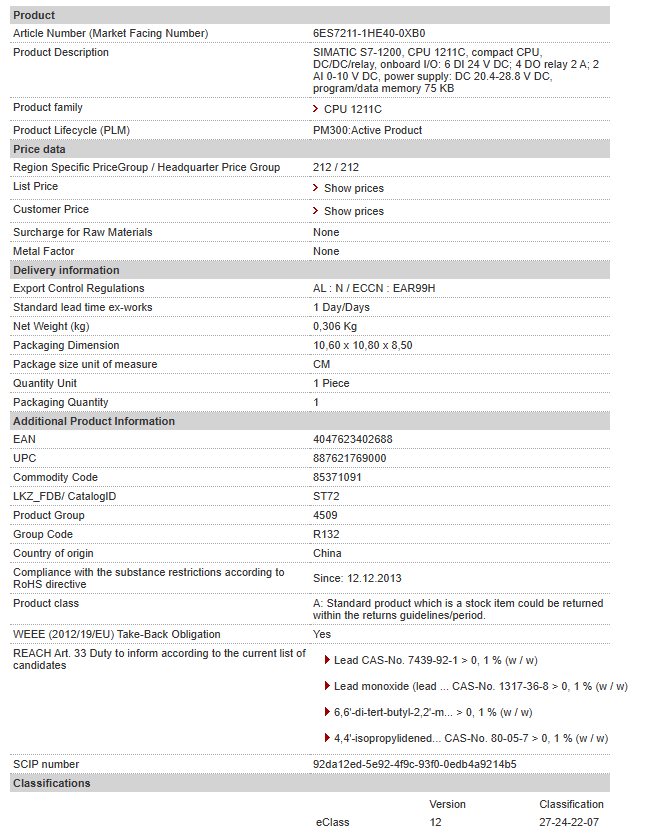| SIMATIC S7-1200, CPU 1211C, compact CPU, DC/DC/relay, onboard I/O: 6 DI 24 V DC; 4 DO relay 2 A; 2 AI 0-10 V DC, power supply: DC 20.4-28.8 V DC, program/data memory 75 KB |